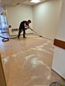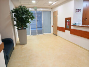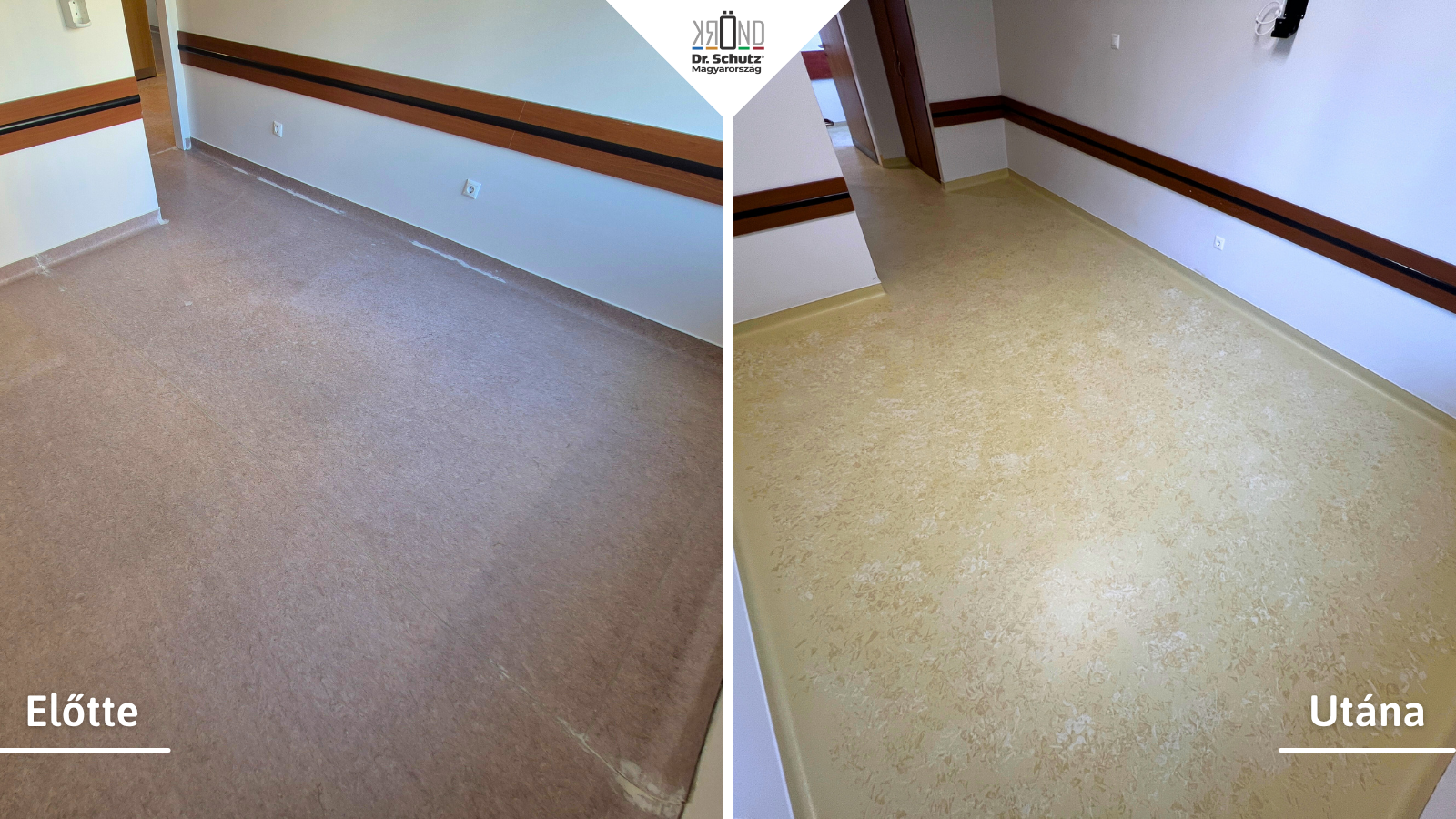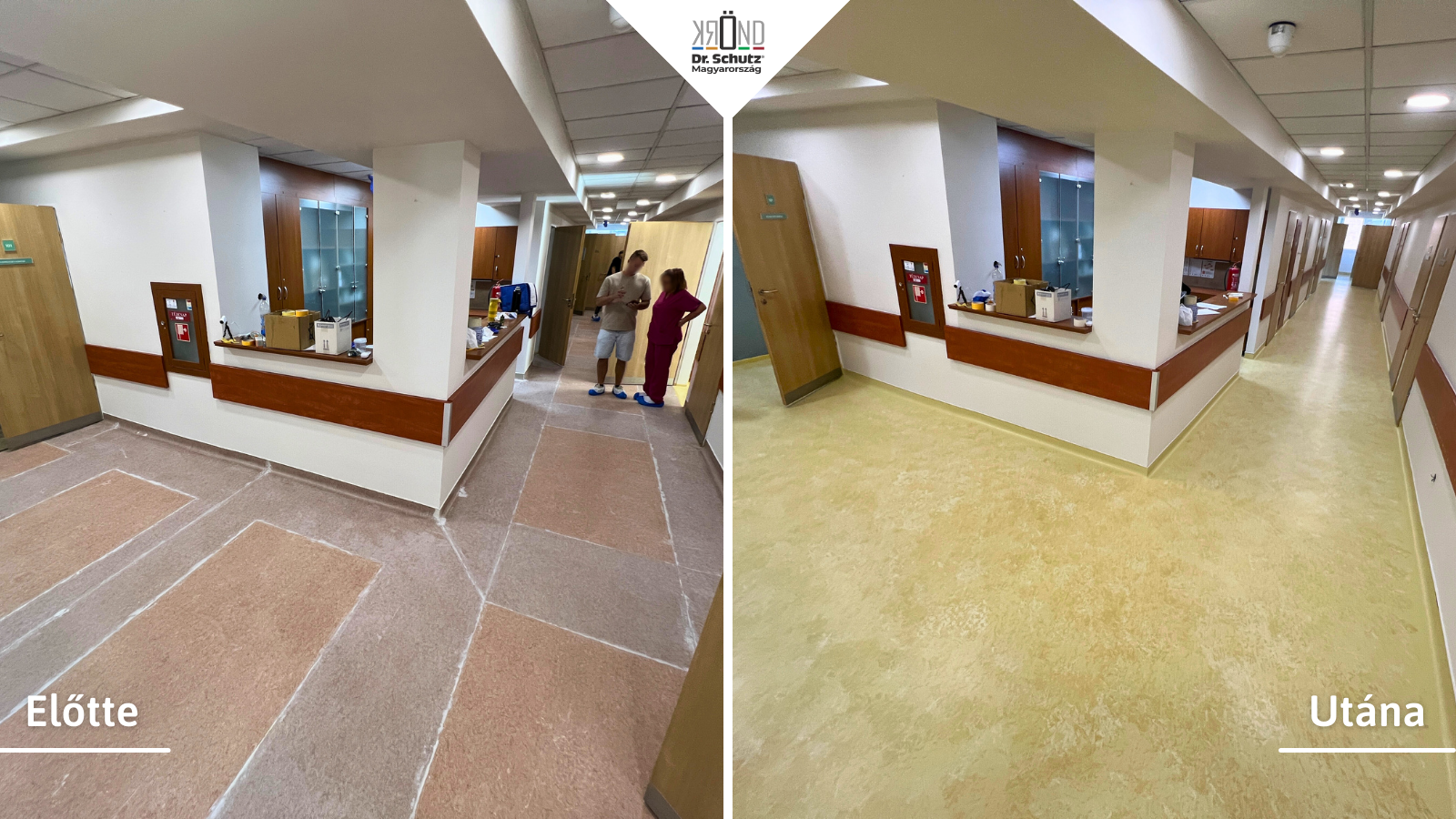 A magánklinika egyik osztályán elhasználódott, karcos és nehezen tisztítható PVC padlóburkolat fogadta a dolgozókat és betegeket. Ez nem csak esztétikailag vált problémává, hanem nehezebbé vált a felület takaríthatósága is és könnyeben elrejtőztek a kórokozók az apróbb padlósérülésekbe.