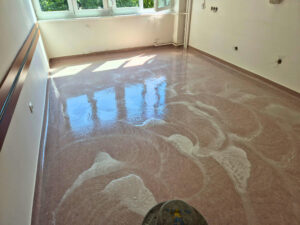 Első lépésként a teljes PVC burkolatot alaposan megtisztítottuk és megcsiszoltuk, hogy eltávolítsuk az évek alatt felrakódott szennyeződéseket és a felületi hibákat. Ezután a nagyobb beszakadásokat és problémákat javítottuk, hogy egy szinte teljesen síkfelületet kapjunk.