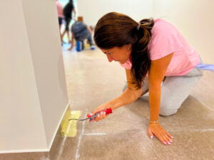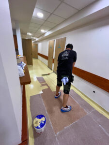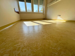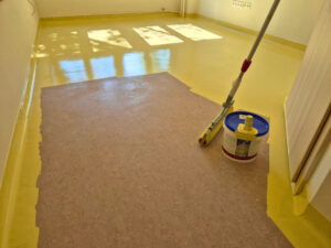Ezután két réteg Dr. Schutz PU Color bevonat került a padlóra, amely nemcsak felfrissíti az elhasználódott PVC-t, hanem elfedi a kisebb hibákat is, új, homogén alapot adva a mintázatnak.